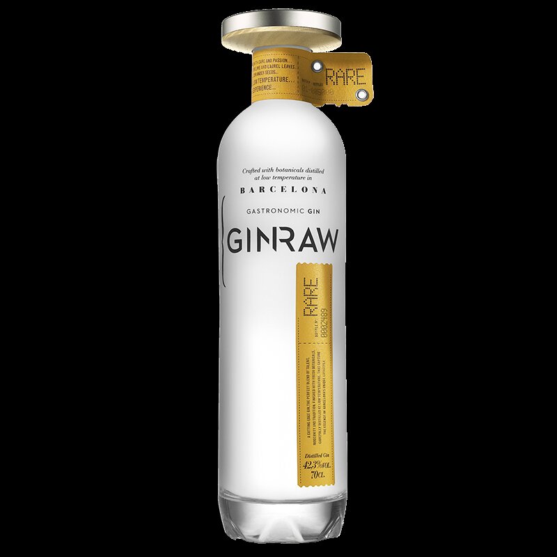 La bottiglia presenta un effetto satinato, che ricorda la bassa temperatura, caratteristica del processo di distillazione di questo GinRaw. Il tappo è di legno di frassino completato da una sfera di alluminio. Il colore ocra ricorda il sole del Mediterraneo.